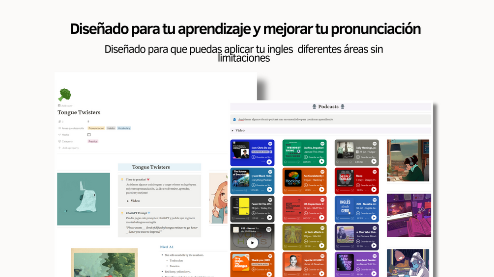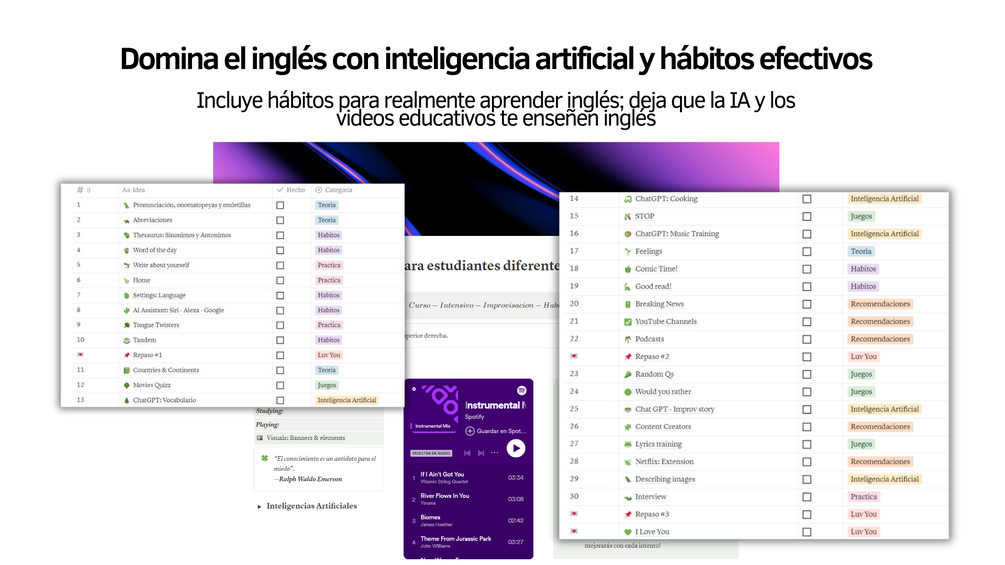 "Vol 1 - Ideas diferentes para estudiantes diferentes" es la herramienta definitiva en Notion para dominar el inglés de manera innovadora y efectiva. La versión completa incluye más de 30 lecciones completas con vídeos instructivos y utiliza inteligencia artificial para mejorar tu experiencia de aprendizaje. Además, proporciona recomendaciones de aplicaciones, podcasts, YouTube y libros para una inmersión profunda en el idioma. El diseño está cuidadosamente pensado para cultivar hábitos de estudio efectivos, asegurando un progreso continuo y fluido.