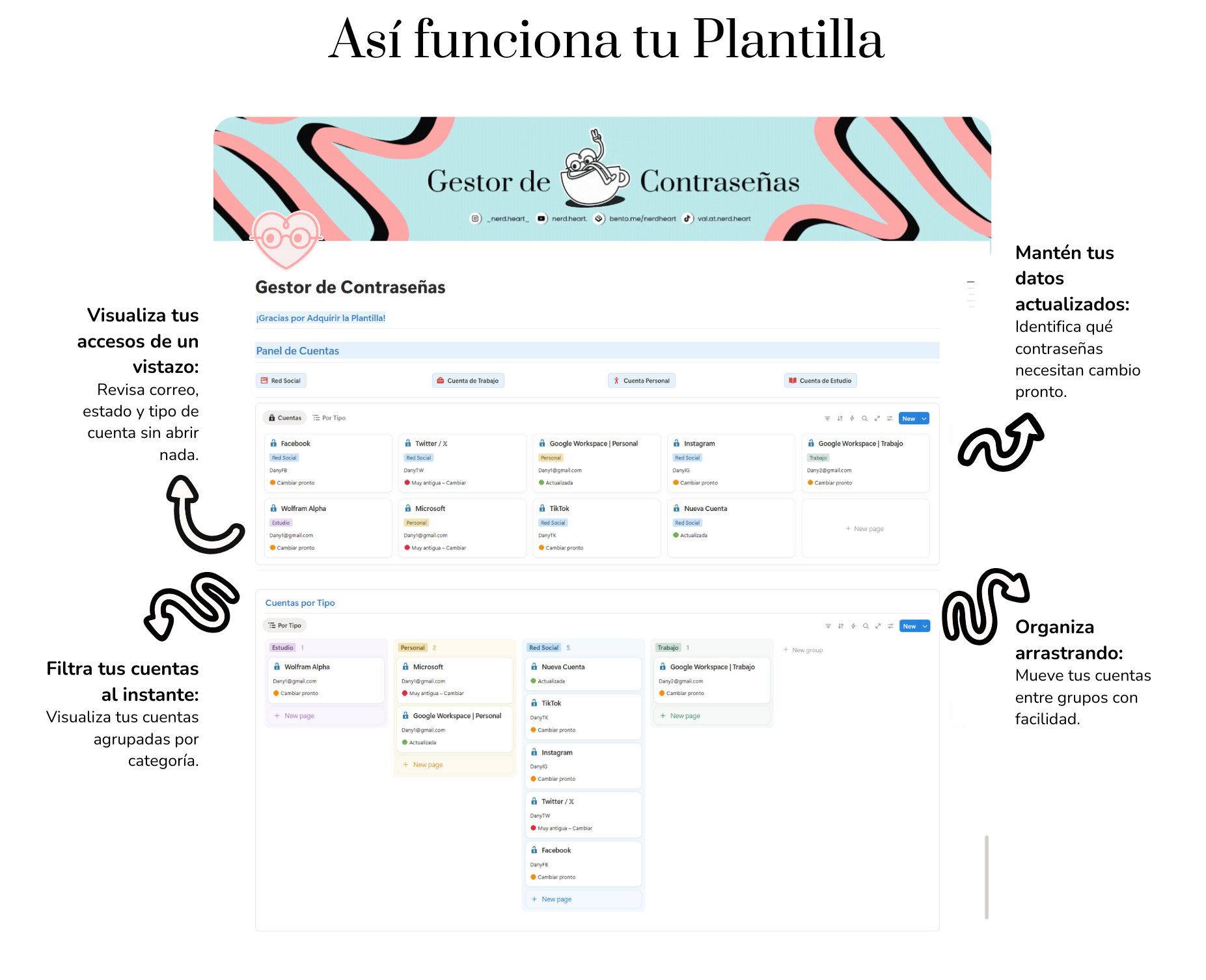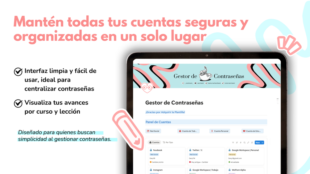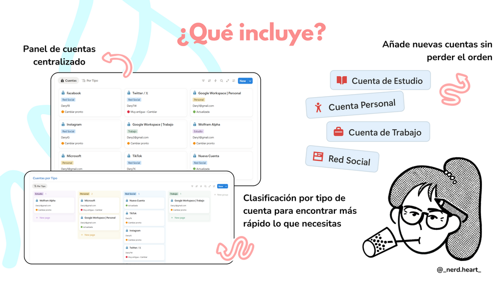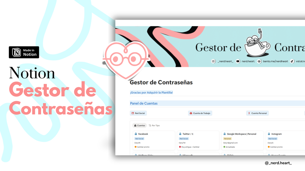 Está diseñado para quienes manejan varias cuentas —ya sea de trabajo, estudio, redes sociales o proyectos personales— y quieren tener un sistema claro, visual y fácil de mantener. Sin complicaciones técnicas, sin exceso de bases de datos, solo lo esencial para que siempre tengas tu información bajo control.